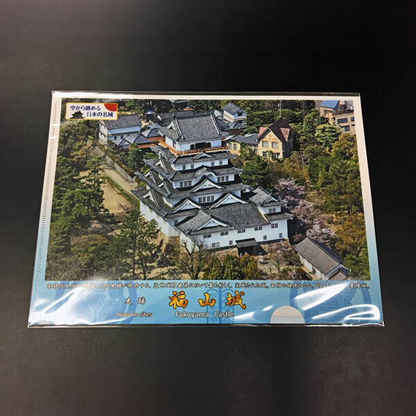 表面は福山城のアップ、裏面はお堀まで入れた広めの航空写真とお城の略歴が載っています。